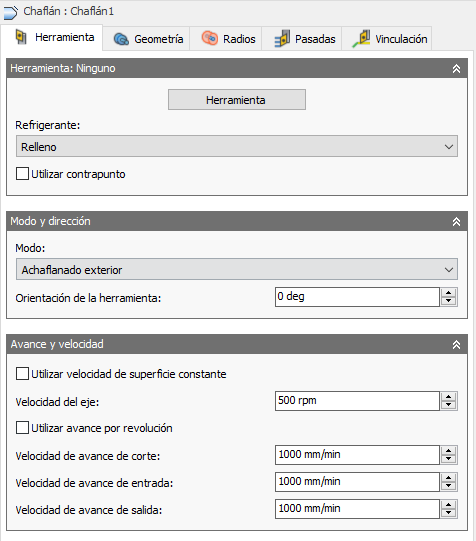 Se muestran de izquierda a derecha: Extensión - Anchura del chaflán - Ángulo