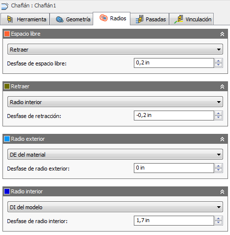 La ficha Radios permite establecer un área de contención radial para el mecanizado. El cuadro de diálogo cambia en función de si el Modo de torneado (parámetro de ficha Herramienta) se establece en Achaflanado exterior o Achaflanado interior. Estos parámetros siguen un código de color para facilitar su identificación.