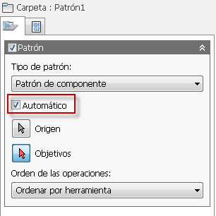 - Por último, en el menú desplegable Orden de las operaciones:, elija si el patrón debería reordenar las operaciones en función de la herramienta u operación, o bien mantener el orden de las operaciones dentro del patrón.