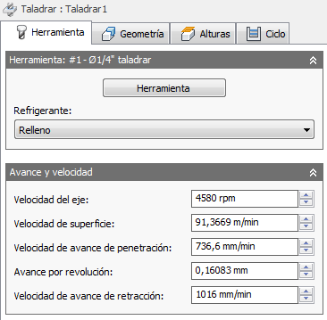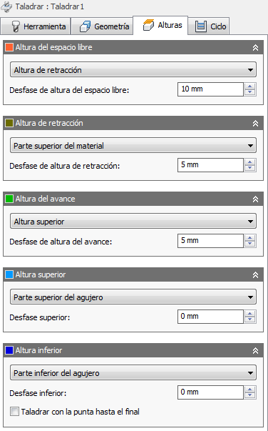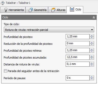 La selección de un ciclo de taladrado determina los parámetros que se pueden especificar para la operación de taladrado.