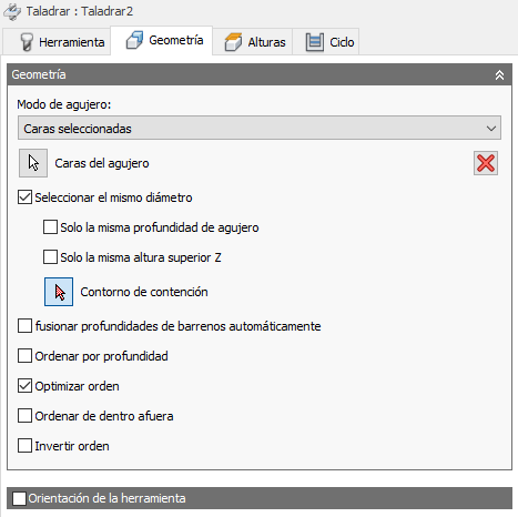 Contiene el número de caras seleccionadas para el taladrado. Se utiliza para la selección de operaciones basada en modelos. Utilice la X para desmarcar todos los elementos seleccionados.