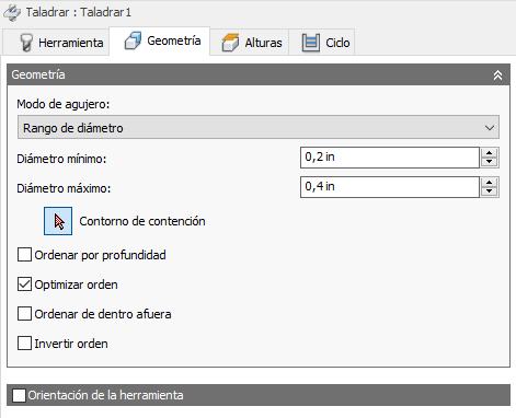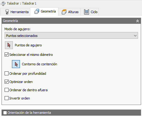 Contiene el número de puntos o curvas de arista que se ha seleccionado para el taladrado. Se utiliza para la selección de agujeros basada en la geometría. Utilice la X para desmarcar todos los elementos seleccionados.