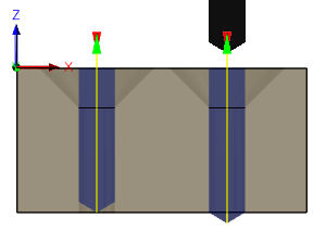 "Ejemplo": si un agujero se ha punteado o escariado primero, es posible que desee iniciar el taladrado desde un espacio libre por encima de esa área mecanizada. Al activar la opción de fusionar automáticamente, se inicia el taladrado desde encima del segmento de agujero más alto.