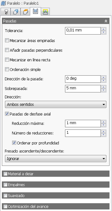 Acabado paralelo es una de las estrategias de acabado más utilizadas. Las pasadas son paralelas en el plano XY y siguen la superficie en la dirección Z. Se puede elegir el ángulo, así como la sobrepasada en la dirección horizontal. Las pasadas pueden estar vinculadas en un patrón en zigzag, pueden ser unidireccionales o estar divididas en secciones de fresado descendente o ascendente. Las pasadas de acabado paralelas son más adecuadas para las áreas superficiales y pueden confinarse para realizar el mecanizado solo hasta un ángulo de contacto determinado. Además, una opción para dividir las pasadas en áreas de mecanizado descendente puede ser una ventaja al utilizar herramientas de inserción que requieren presión en las inserciones para obtener un rendimiento óptimo.