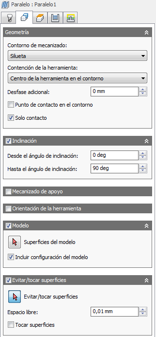 Si está activada, puede seleccionar las superficies que deben evitarse. Las rutas de herramienta permanecen alejadas de las superficies seleccionadas una distancia especificada.
