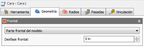 Se utiliza para limitar la ruta de herramienta al confinar un área. Las rutas de herramienta pueden estar contenidas dentro de una región específica. El modo frontal permite establecer el punto de referencia para definir el área de contención, y el desfase permite ajustar el contorno positivo o negativo de dicha referencia. Puede utilizar estas opciones para extender la ruta de herramienta más allá del modelo para un corte más largo.