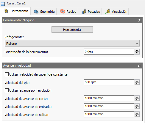 La ficha Radios permite establecer un área de contención radial para el mecanizado. Estos parámetros siguen un código de color para facilitar su identificación.