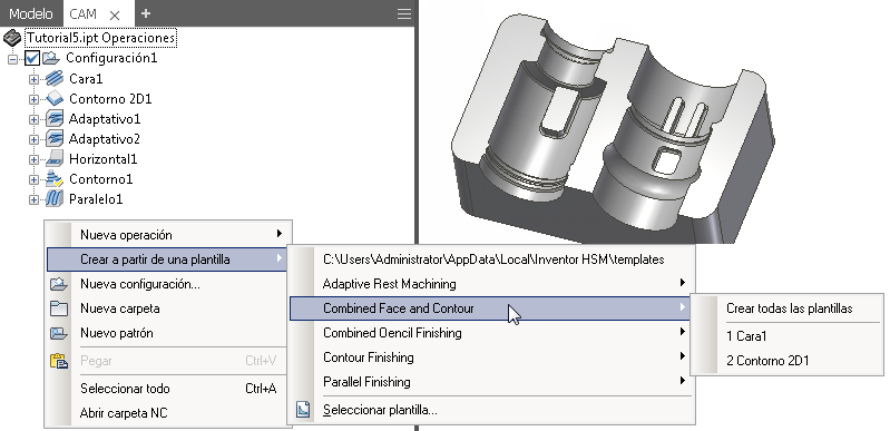 Una nueva operación se crea a partir de una plantilla mediante la entrada de menú Crear a partir de una plantilla también disponible en el menú contextual emergente del Navegador de CAM. En esta entrada de menú, se muestran automáticamente todas las plantillas almacenadas en la última carpeta de plantillas seleccionada. Como se indica en la imagen siguiente, las plantillas compuestas se muestran como submenús que le permiten crear fácilmente operaciones para todas las plantillas de operación (Crear todas las plantillas) o desde plantillas de operación individuales.
