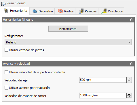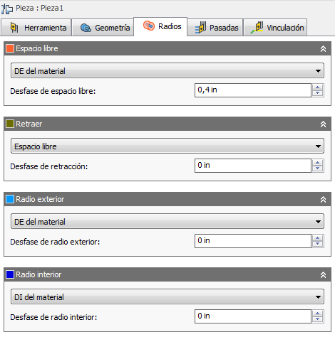 La ficha Radios permite establecer un área de contención radial para el mecanizado. Estos parámetros siguen un código de color para facilitar su identificación.