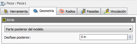 Se utiliza para limitar la ruta de herramienta al confinar un área. Las rutas de herramienta pueden estar contenidas dentro de una región específica. El modo posterior permite establecer el punto de referencia para definir el área de contención, y el desfase permite ajustar el contorno positivo o negativo de dicha referencia. Puede utilizar estas opciones para extender la ruta de herramienta más allá del modelo para un corte más largo.