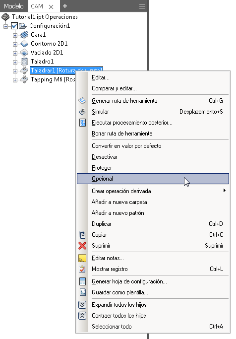 Para hacer que una operación sea opcional, haga clic con el botón derecho del ratón en la operación en el Navegador de CAM y seleccione Opcional en el menú contextual emergente. Puede hacer que la operación vuelva a no ser opcional seleccionando Opcional una vez más.