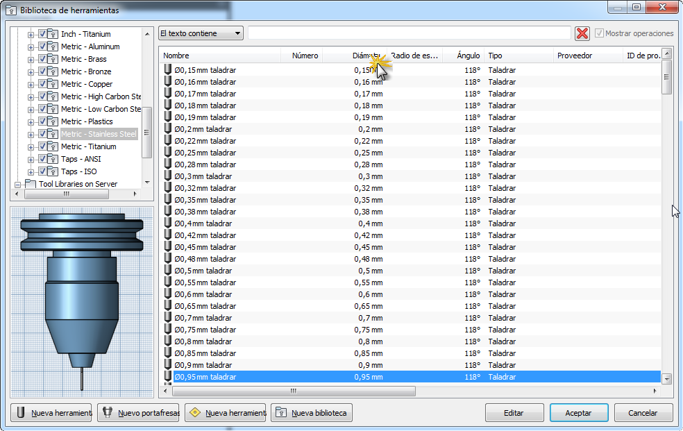 Se puede ordenar la lista de herramientas en la Biblioteca de herramientas haciendo clic en las columnas de campo. Por ejemplo: si desea que la lista de herramientas se ordene por diámetro, simplemente haga clic en la columna Diámetro. Al hacer clic en la misma columna dos veces, se alterna entre el orden ascendente y descendente.