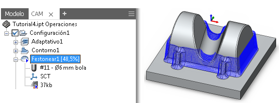 Si se selecciona una operación de cálculo, la vista preliminar muestra la ruta de herramienta generada hasta ese punto. Esto puede resultar muy útil para detectar parámetros incorrectos en las fases iniciales del proceso (como un contorno de mecanizado incorrecto) sin necesidad de tener que esperar a que el cálculo se complete.