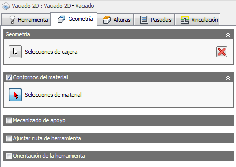 Si está activada, se calcula la ruta de herramienta para considerar los contornos de material definidos o un contorno seleccionado. El contorno por defecto es el cuadro Material especificado en la Configuración. También puede seleccionar aristas del modelo o un contorno de boceto. Esto proporciona espacio libre adicional para los movimientos de entrada y salida. Puede limitar o extender el área de mecanizado. Déjela desactivada para cajeras de contorno cerrado.