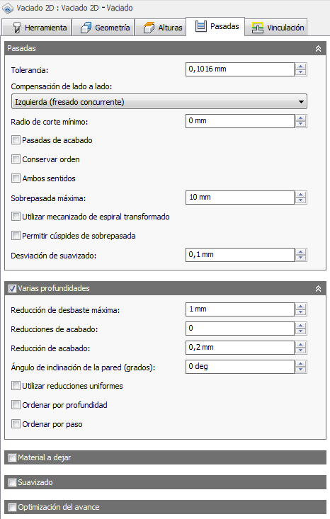 Cantidad máxima de suavizado aplicada a las pasadas de desbaste. Utilice este parámetro para evitar esquinas pronunciadas en la ruta de herramienta.