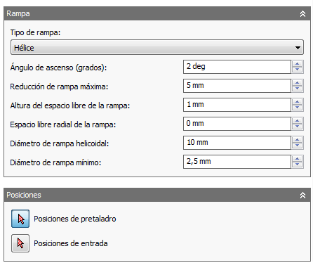 ![]() Pretaladro Para usar la opción Pretaladro, deben definirse las ubicaciones de pretaladro. |