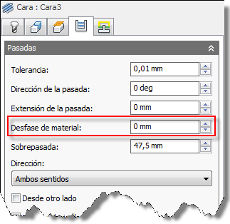El parámetro Desfase de material en la ficha Pasadas