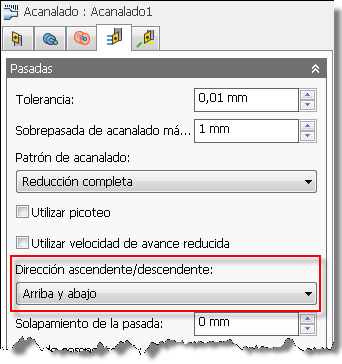 En la estrategia Acanalado de torneado, el parámetro Dirección ascendente/descendente controla la dirección de las pasadas de acabado y puede ser Arriba y abajo, Solo hacia abajo o Solo hacia arriba.