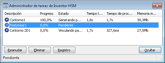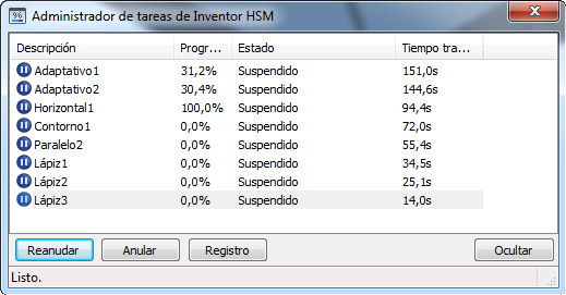 Por defecto, el Administrador de tareas bloquea el resto de la interfaz de usuario. Esto permite que el núcleo utilice todos los recursos de la CPU, puesto que el resto de Inventor CAM y de Inventor está inactivo. Sin embargo, si no se desea esperar a que la generación termine, simplemente haga clic en el botón Ocultar del cuadro de diálogo. Esto permite seguir trabajando mientras la ruta de herramienta aún se está calculando en segundo plano.