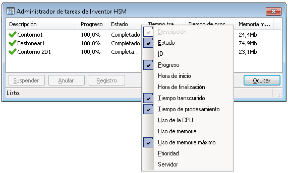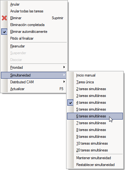 Cuando se regeneran varias tareas, Inventor CAM ejecuta automáticamente varios trabajos de forma simultánea. Estas tareas corresponden al número de núcleos de CPU en su sistema, ya que suele proporcionar el mejor rendimiento. Si desea modificar este comportamiento, haga clic con el botón derecho en la lista y elija un parámetro Simultaneidad diferente.