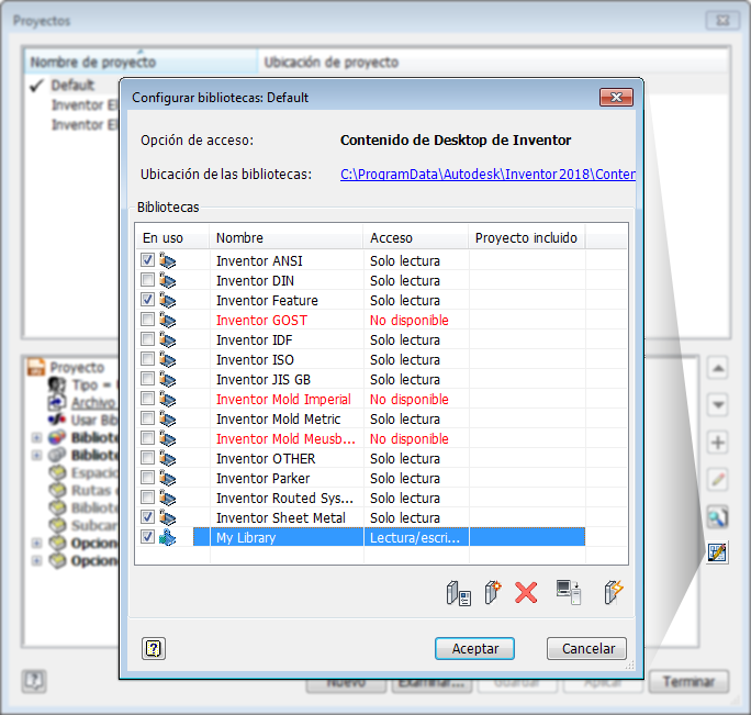 Si la ubicación del grupo de trabajo o la biblioteca es una subcarpeta de otra ubicación definida, Inventor resalta en rojo la ruta inválida. Sin embargo, podrá guardar el archivo de proyecto. Se trata solo de una advertencia que indica que la ubicación no equivale a la estructura de archivos más eficaz.