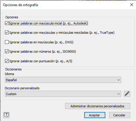 - Con Inventor se instala un diccionario personalizado vacío que está activo por defecto. Si desea añadir o crear otros nuevos, pulse la flecha hacia abajo para cambiar a otro diccionario personalizado activo.