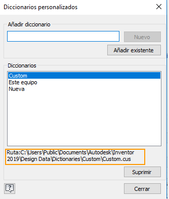 Nota: La ubicación por defecto de los diccionarios personalizados predeterminados y recién creados es la carpeta Datos de diseño.