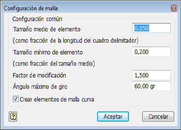 Utilice Configuración de malla para controlar manualmente el tamaño medio del elemento, el tamaño mínimo de elemento, el factor de modificación y el ángulo máximo de giro.