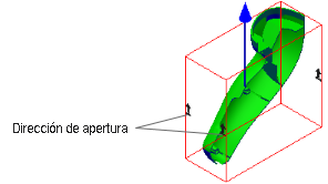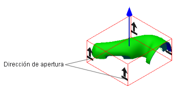 La dirección por defecto de apertura del molde se alinea con el eje Z positivo. Dado que muchos de los modelos de pieza de plástico se crean aleatoriamente, la dirección de la pieza de plástico y la de la apertura del molde son a menudo distintas. La operación Ajustar orientación se utiliza para ajustar estas dos direcciones a fin de que sean coherentes.