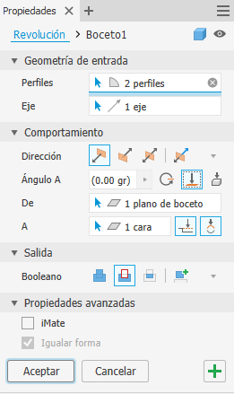 Para los siguientes pasos consulte a continuación Definir la operación de revolución con el panel de propiedades.