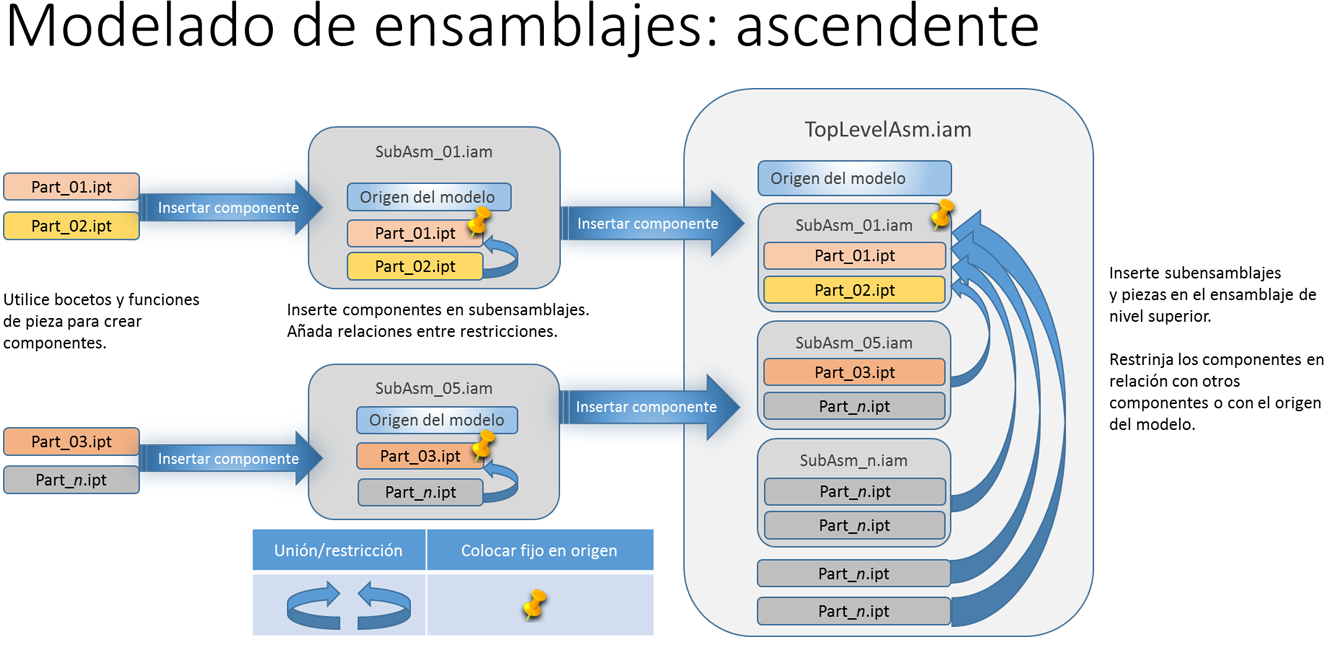 El método tradicional para crear ensamblajes es el ascendente. En primer lugar, se definen las distintas piezas. Luego, se incluyen en subensamblajes mediante restricciones de ensamblaje. Tras ello, los subensamblajes se insertan en ensamblajes de mayor nivel hasta llegar al ensamblaje de nivel superior, con lo cual el recorrido es ascendente (de abajo a arriba). Este método de ensamblaje da lugar a ensamblajes con un gran número de relaciones entre las piezas y los ensamblajes.