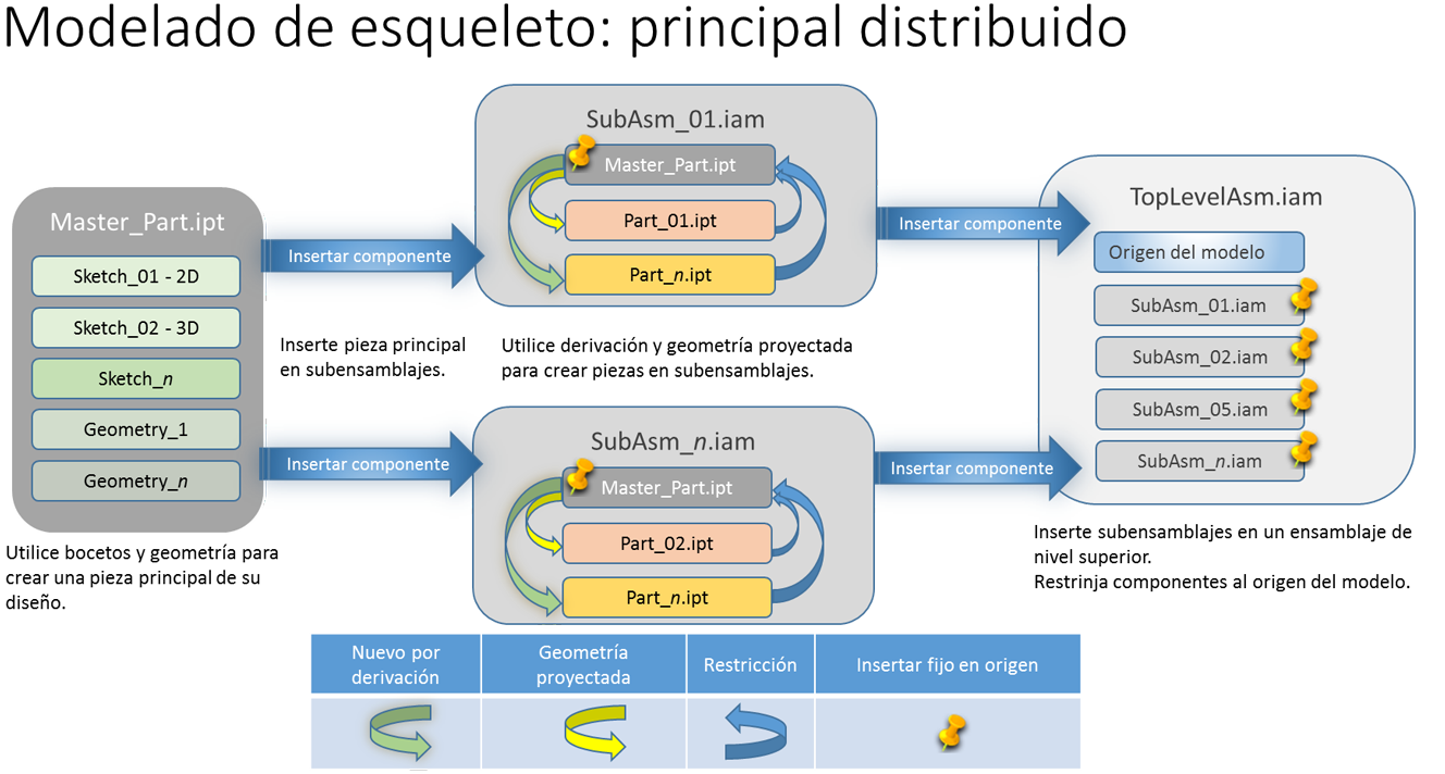 En el diseño principal distribuido se utiliza una única pieza principal, compuesta de bocetos y geometría, para definir el ensamblaje final. Se hace referencia a esa pieza principal en los distintos subensamblajes y piezas según sea necesario. La pieza principal controla el diseño global. El ensamblaje y los subensamblajes se definen o insertan con respecto a la pieza principal. Cada subensamblaje tiene su propio esqueleto y controla una parte del diseño en sí mismo. Los esqueletos de nivel superior se utilizan para controlar el mecanismo o boceto global del ensamblaje, mientras que los de nivel inferior se utilizan para controlar la geometría de las piezas.