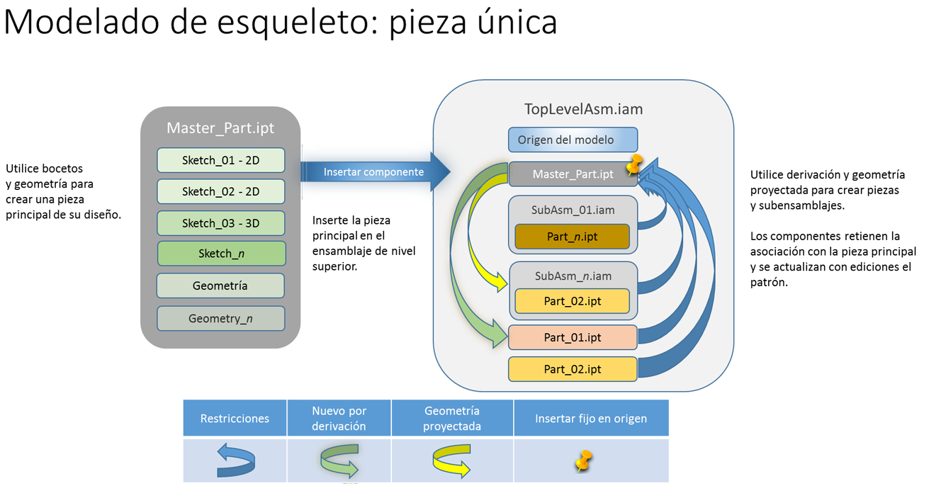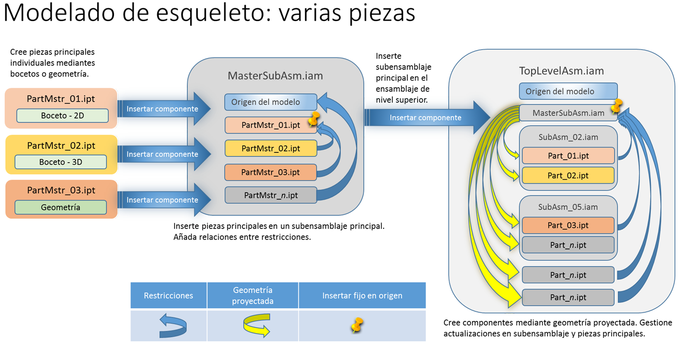En el proceso multinivel se utilizan varias piezas principales individuales agrupadas en bocetos que constituyen el ensamblaje final. Las piezas principales se insertan y restringen en un subensamblaje principal. Este subensamblaje principal está insertado en el ensamblaje de nivel superior. En el ensamblaje de nivel superior, los componentes 3D individuales se modelan con la geometría proyectada desde el subensamblaje principal y sus piezas principales. Los componentes 3D pueden estar contenidos en subensamblajes lógicos o bien ser independientes, según cuáles sean los requisitos de diseño.