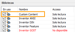 Procedimiento para instalar y añadir la biblioteca personalizada de Inventor al proyecto activo