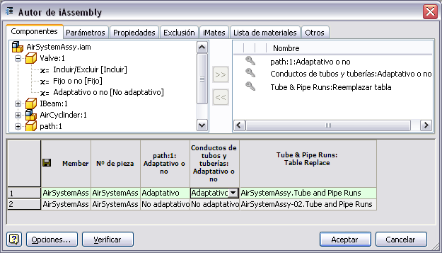 - El conjunto de componentes intercambiables de tubos y tuberías se ha iniciado con dos miembros de ensamblaje principal de conductos para que pueda cambiarse por la fila de configuración deseada mediante la lista desplegable Reemplazo de tabla.