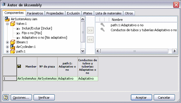 - Una vez que haya completado el resto de propiedades iAssembly de Inventor, pulse Verificar para validar la configuración del ensamblaje. Por ejemplo, un miembro de ensamblaje principal de conductos solo puede ser adaptativo una vez en la familia iAssembly y la columna CTDAD de la lista de materiales solo puede contener un número o la cadena Por defecto.