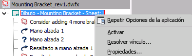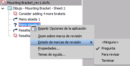 El navegador de marcas de revisión mostrará el conjunto de marcas en la vista del árbol. Una vez revisadas las marcas, se puede cambiar su estado y añadir comentarios que se guarden con la marca de revisión. En el navegador Marcas de revisión, pulse con el botón derecho una marca de revisión para cambiar su estado y acceder al cuadro de diálogo Propiedades de marca de revisión.