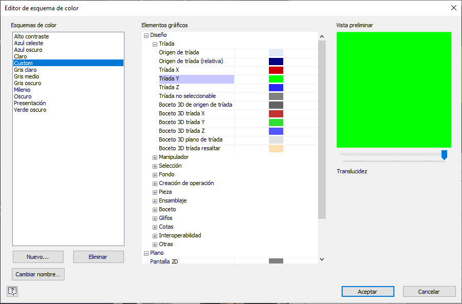Utilice el Editor de esquemas de color a fin de personalizar los esquemas de color de los elementos gráficos que se utilizan en Inventor.