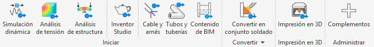 Nota: Simulación dinámica y Análisis de tensión están disponibles en los productos Autodesk Simulation y en Autodesk Inventor Professional. Cable y arnés y Tubos y tuberías solo están disponibles en Autodesk Inventor Professional.