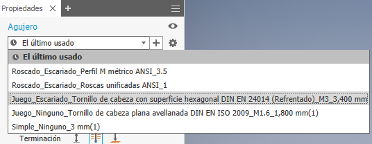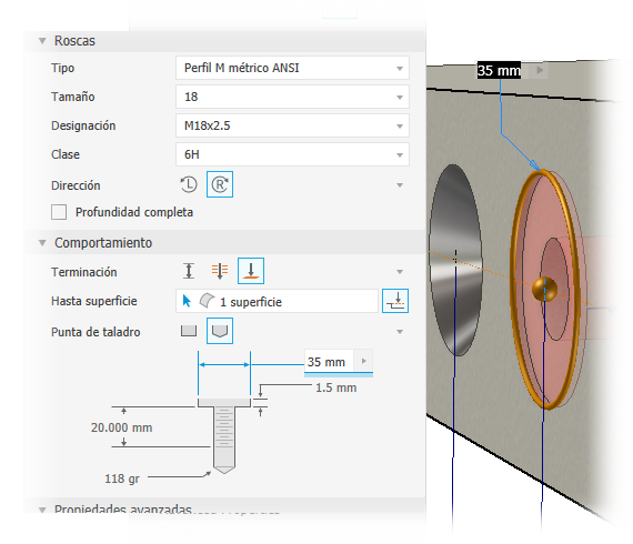 Se muestra el panel de propiedades y puede modificar los parámetros de la operación de agujero.