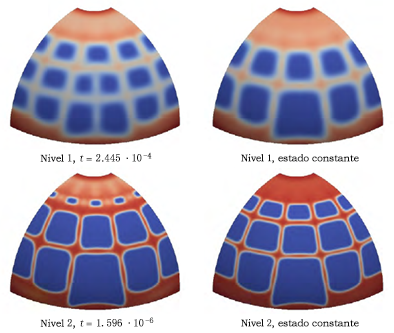 Con el Generador de forma, se puede reproducir el resultado publicado. Aunque la mayor parte del resultado generado se ajusta a los resultados publicados, se aprecian algunas diferencias destacables en la arista inferior del hemisferio. En el Generador de forma, solo queda una capa fina de material cuando se aplican las condiciones de contorno. En los resultados publicados se muestra una banda de material mucho más gruesa en torno a la arista inferior del hemisferio. Además en los resultados publicados aparece alguna variación en el grosor de esta banda de material, probablemente debido a las condiciones del contorno de simetría.