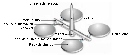 El sistema de alimentación distribuye el plástico fundido desde la boquillade la máquina a todas las cavidades del molde.