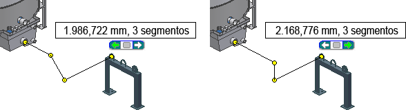 Al seleccionar geometría válida, como dos aberturas circulares, vértices o puntos de trabajo, el sistema genera los segmentos y puntos de enrutamiento necesarios. Puede existir más de una solución de enrutamiento en función de los puntos seleccionados. En tal caso, se muestra el comando Seleccionar otro. Puede recorrer las distintas soluciones al crear el enrutamiento o cuando lo modifique posteriormente, y seleccionar la que mejor se ajuste a sus necesidades.