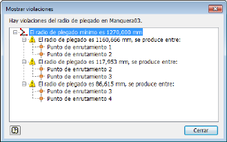 Utilice la comprobación de radio de plegado para comprobar los pliegues que violan el radio de plegado mínimo . Es posible realizar la comprobación de radio de plegado en un enrutamiento de manguera flexible seleccionado. En caso de que se detecten violaciones, aparecerá un icono junto al enrutamiento en el navegador.