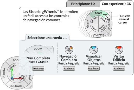 SteeringWheels, también conocido como "ruedas", son menús dinámicos (que siguen al cursor). Combinan muchas de las herramientas de navegación comunes en una sola interfaz.