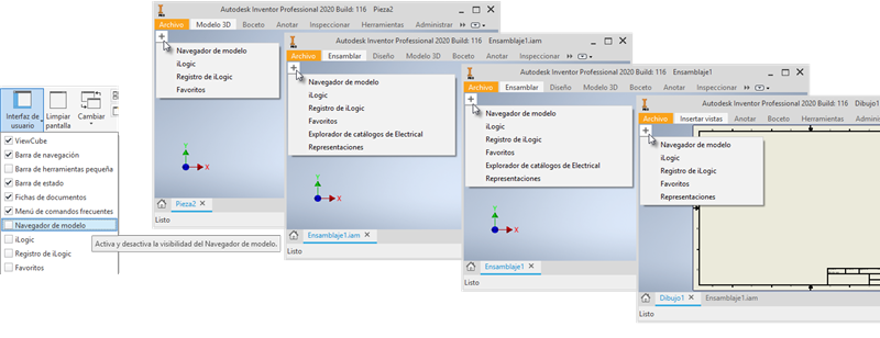 - Paneles. Todos los paneles se pueden desplazar, añadir o eliminar de un panel existente. Solo hay que arrastrar la ficha correspondiente. Los paneles también pueden anclarse en paralelo, o bien desanclarse y aparecer flotantes por separado, e incluso anclarse fuera de Inventor.