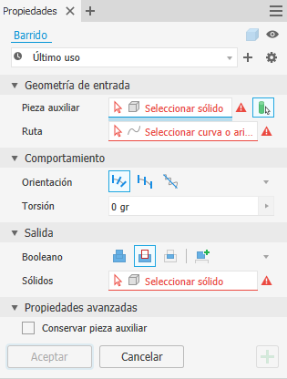 . Añade el volumen creado por la operación de barrido a otra operación u otro cuerpo. No disponible en el entorno de ensamblaje.
