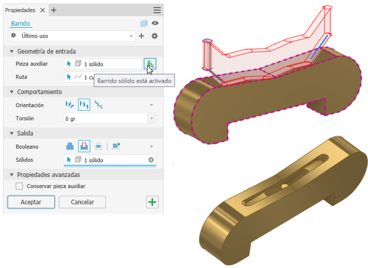 Además de un nuevo panel de propiedades para un flujo de trabajo simplificado, el Barrido sólido permite barrer una pieza auxiliar sólida a lo largo de una ruta. En el siguiente ejemplo se muestra una ruta de barrido fijo sin torsión para simular una trayectoria.