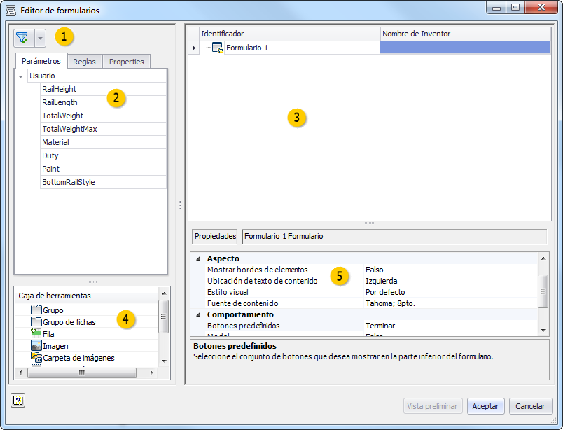 PropiedadesDefina las propiedades del elemento resaltado en el árbol de diseño de forma. Las propiedades varían en función del elemento seleccionado.