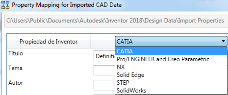 - En el cuadro de diálogo Asignación de propiedades para datos de CAD importados, haga clic en el menú desplegable y seleccione el formato al que desea asignar las propiedades estándar de Inventor. Cuando la herramienta Asignación de propiedades se inicia desde el cuadro de diálogo Importar, el formato se establece por defecto en el formato del archivo que va a importar.